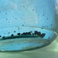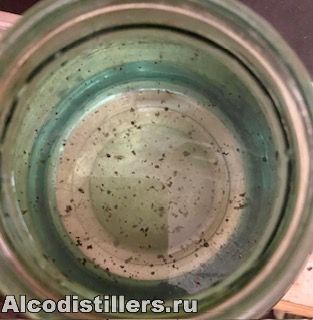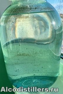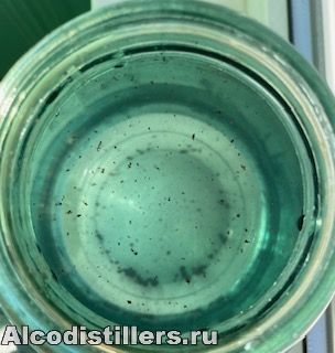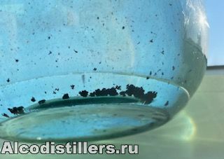Приветствую господа винокуры! Перегнал я свое односолодовое сусло… получилось порядка 260мл АС с килограмма. Гнал до воды но возник вопрос после определенного отобранного объема (%) пошли черные жирные вкрапления…. По мере снижения % их становилось больше. На фото три литра крепостью 6%