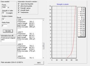Примерно тоже при 6 тарелках. Тогда дельта 0,5С как раз между верхом и 4-й тарелкой (2/3). В отборе при этом примерно 94,5%, и 72,3С.