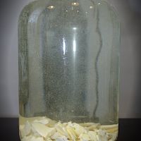 Цвет появился приятный, а вкуса хрена нет,  мягенько идёт, но закусывать хочется. На фото сушёный концентрат на крышке. Цвет оцените... Не понравился вкус, два дня назад утречком сходил за корнями хрена, вымыл, подсушил, очистил, порезал,  закинул в ту же банку, через два дня  дегустировал. Родственник  приехал из Украины, попал на дегустацию. Понравилась вторичная хреновуха, я после второй рюмки перешёл на чачу, он с хреновухи не слезал. Сушку хрена забраковал и поделился опытом соседа. Тот копает хрен, подвешивает на ниску и Керхером отмывает от грязи. Часок просушка от влаги, обрезка торцов, резка на кубики и фасовка по пакетам- дозировка на трёхлитровку. На заморозку. Появилась "огненная вода", из холодильника достал заветный пакетик, развернул, и не размораживая,  в банку. Вкусовые качества как со свежего...