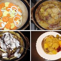 Морковка, лук, картошка слоями, на верхние слои колбаски. Немного соли, черного перца, сметанки. Капельку мелассы и в духовочку на 180-200с Часика полтора под крышкой, потом еще минут 20 без нее, чтоб только-только корочка появилась. Надо будет механически попробовать ободрать эту кастрюльку, типа проволочной щеткой на болгарке, но сомневаюсь.![]()