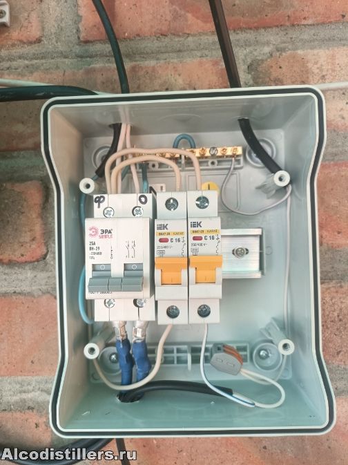 Пусть не эстэтично и непрофессионально, зато работает. Перемычки поставил проводом 4кв, сейчас думаю поспешил, можно было 2.5кв,да и проще в монтаже. Автомат на 25А не стал ставить, дюже мощный для моего домового хозяйства.