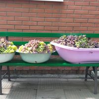 Там два сорта. Белый - столовый, названия не знаю, вкус с кислинкой. Его в семье кроме меня никто не ест. А розовый - мускат Гамбургский, оба достигли технической спелости.