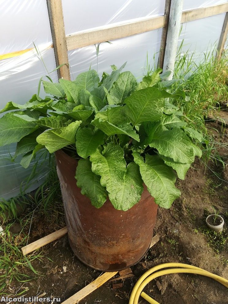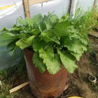 У нас дикий хрен совсем плохо растёт, корешки максимум сантиметров 10 в длинну успевают вырасти, то-ли из-за мерзлоты или из-за того что зимой прошлогодние корни перемерзают. В магазине привозной продают от 1200 до 2400 р за кг (в зависимости от качества) . Вот этой весной с краснадара заказал корень и посадил его в теплице в бочку 200л, фото недельной давности, как думаете комфортно ему в бочке будет, успеет к началу сентября вырасти? Листья некоторые уже по 50см. Хотелось бы посмотреть как в тёплых краях на данный момент он выглядит.
