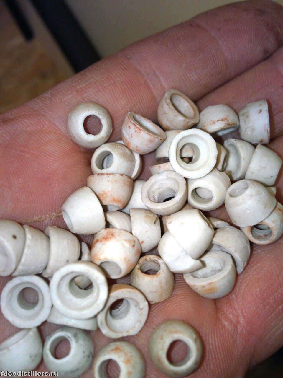 Про керамику как то мало инфы, на фото керамические изоляторы, они чм то схожи с Рашига, они без покрытия (не глянцевые), что возможно даст хорошую смачиваемость. По количеству у меня хватит на метр-полтора царги.