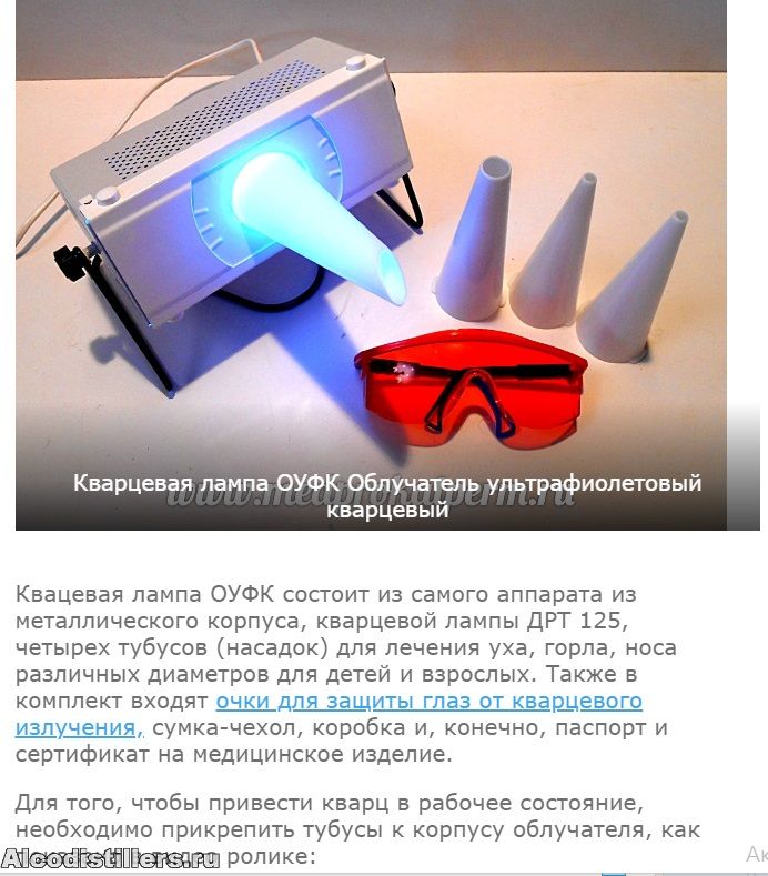 " Рефлектор Минина (лампа Минина, «синяя лампа») — прибор для физиотерапии, вспомогательное лечебное средство. Рефлектор состоит из лампы накаливания с колбой синего цвета и фокусирующего абажура с электрическим проводом для присоединения электропитания. Таким образом, это обычная лампа накаливания, синий же цвет при прогревании переносицы в меньшей мере, нежели другой, проникает сквозь закрытые веки и не ослепляет глаза. Не следует путать данную лампу с ультрафиолетовыми лампами (лампа Вуда, кварцевая лампа), она не излучает ультрафиолетовые лучи и не может заменять соответствующие лампы... "