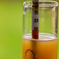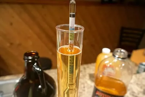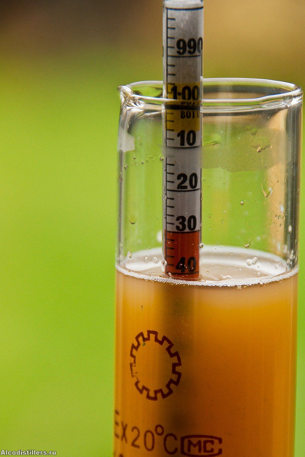 Измерение плотности сусла с помощью ареометра: глубина погружения стеклянной трубки в сусло сообщает о плотности сусла