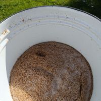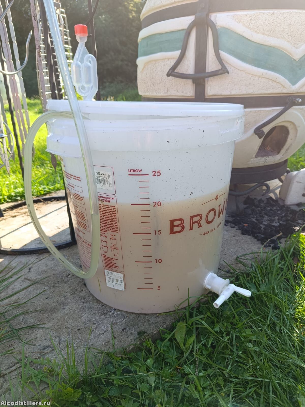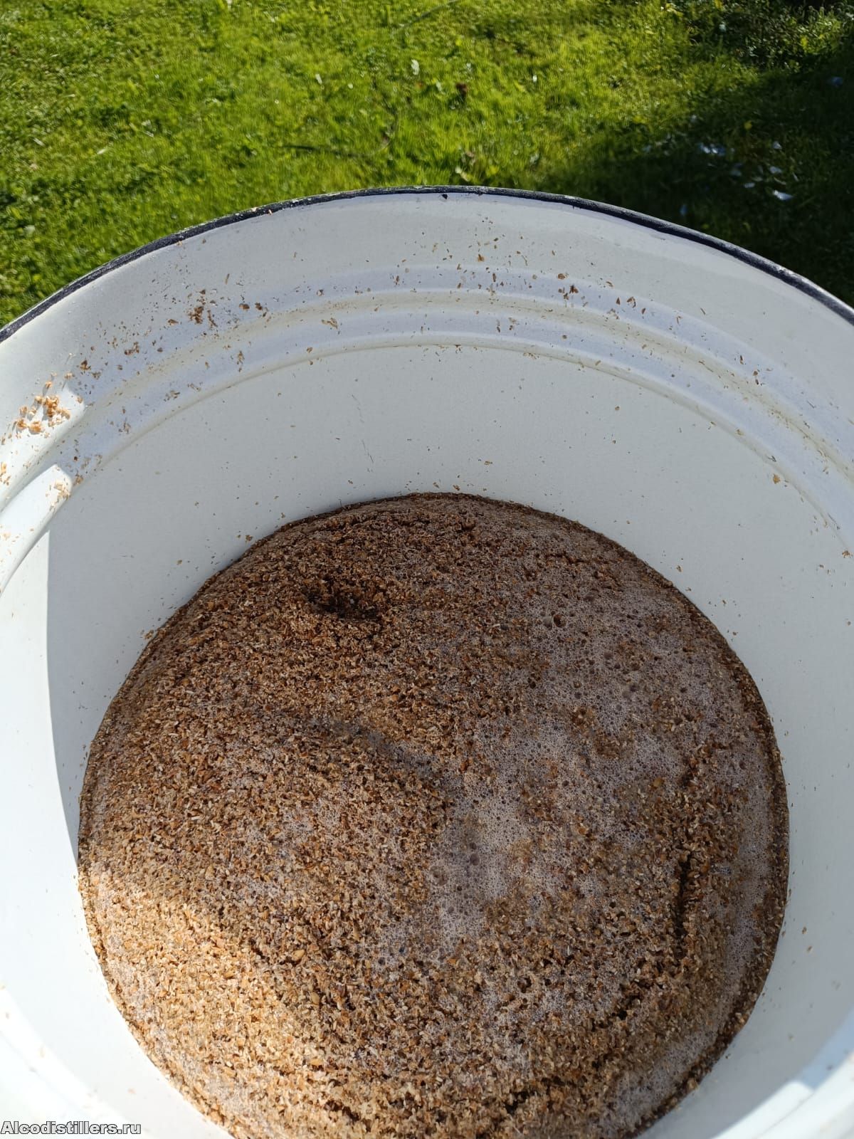 Ржаной зеленый солод, 5 кг, на мясорубке помолот, 1 кг ячменный на мельнице пивной помол. 15 литров воды, 73°,через 3 часа долив 10 литров 73°. До утра осахаривалось. Слилось ровно 20 литров 20 Brix. Результатом доволен.