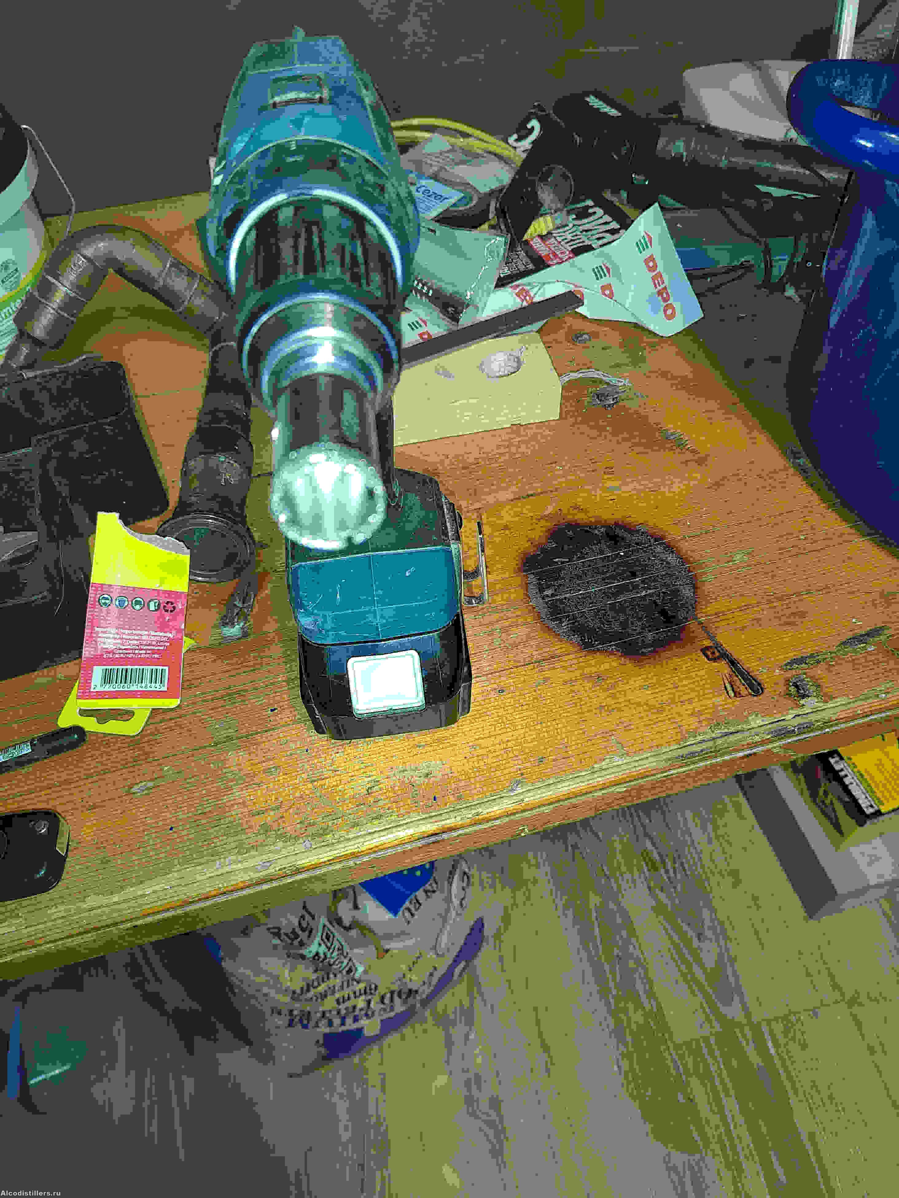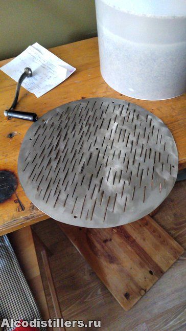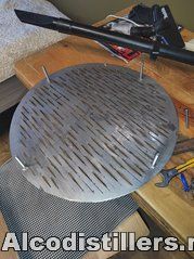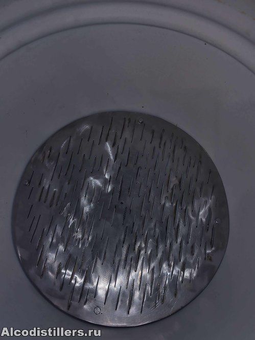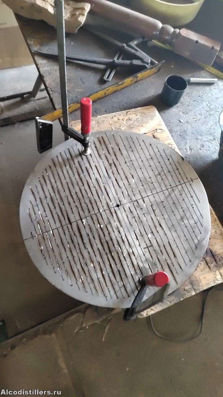 В фальшдно были просверлены отверстия для ножек(болты 6 мм) 4 по кругу каждые 90 % и один в центре. Но! Я не учёл, что центральный болт попадает на базуку. Поэтому он был перевернут, чтоб как ручку его использовать. А в центр будут добавленоысо смещением ещё ножки, поскольку весь вес солода на центр, и будет его погибать. Есть недостатки-сколы на дне кастрюли, зазор по кругу местами 5 мм межде дном и кастрюлей,металл после прорезаний немного выгнуло. Но в целом пока доволен, посмотрим, как будет в работе.