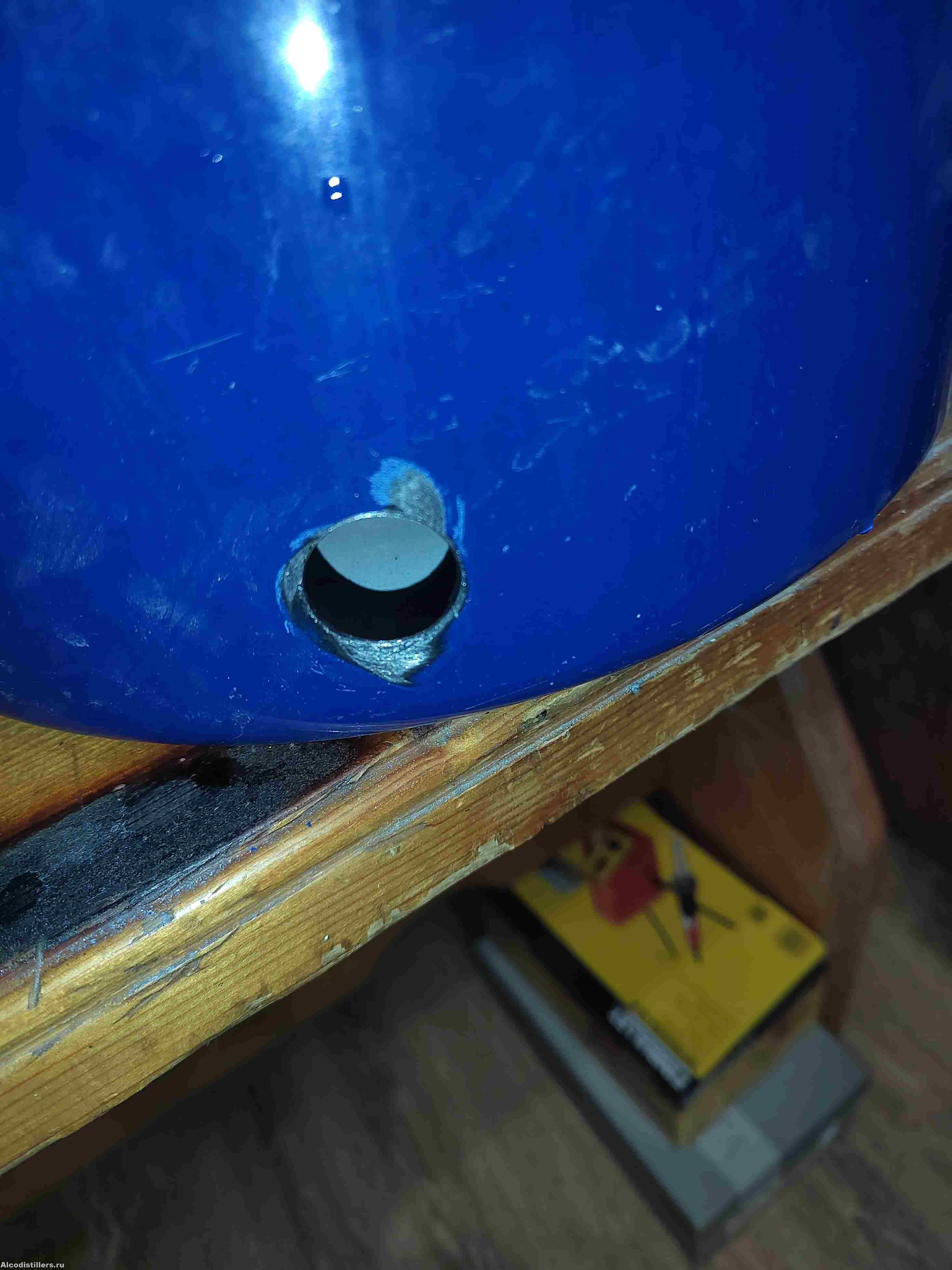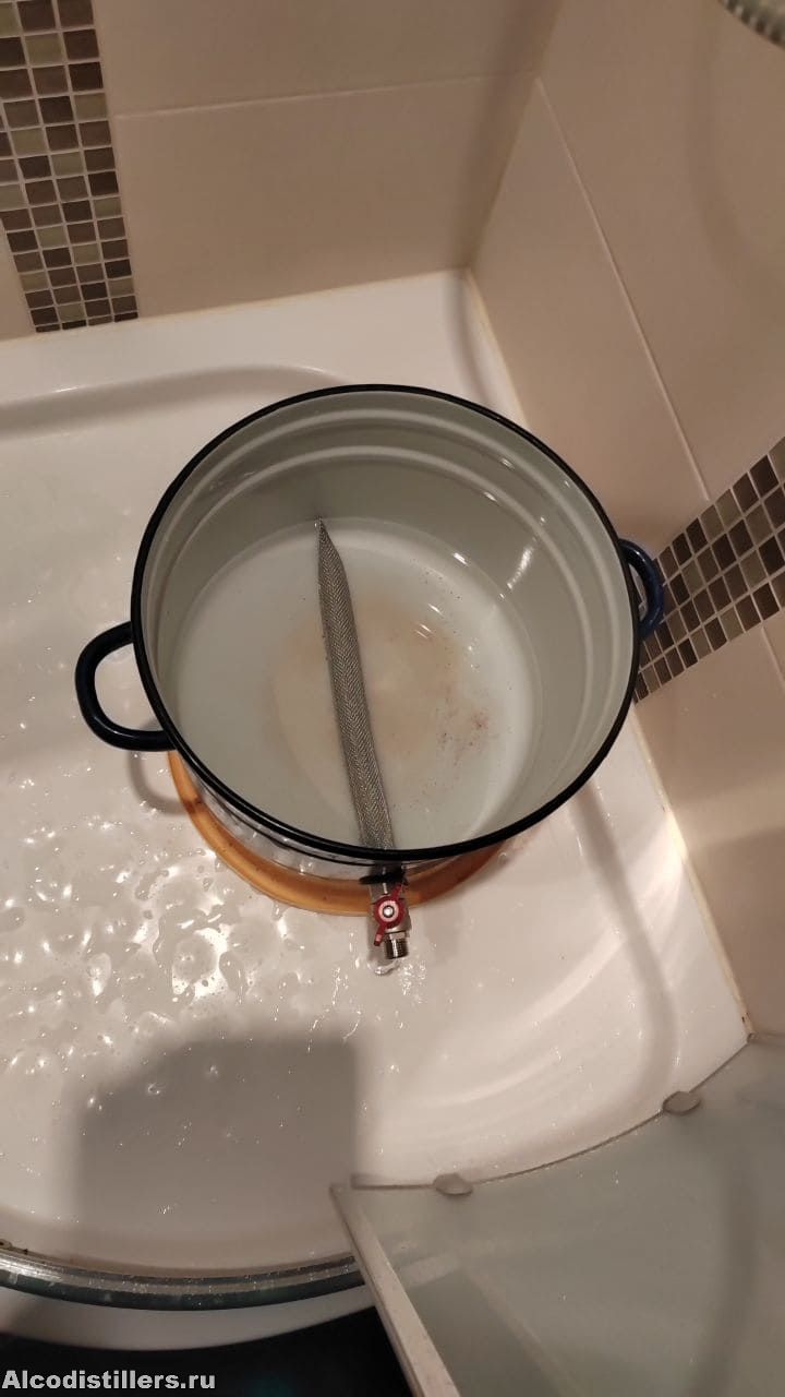 Ступенчатым сверлом просверлил отверстие у самого дна кастрюли(сверлить без сколов). Ниппель 1/2-1/2, изнутри вставил его, и снаружи гайкой стянул. С обеих сторон прокладки силиконовые. К ниппелю изнутри базуку на хомут, снаружи кран 1/2 мама - папа через фумленту. Налил воды-течи нет.