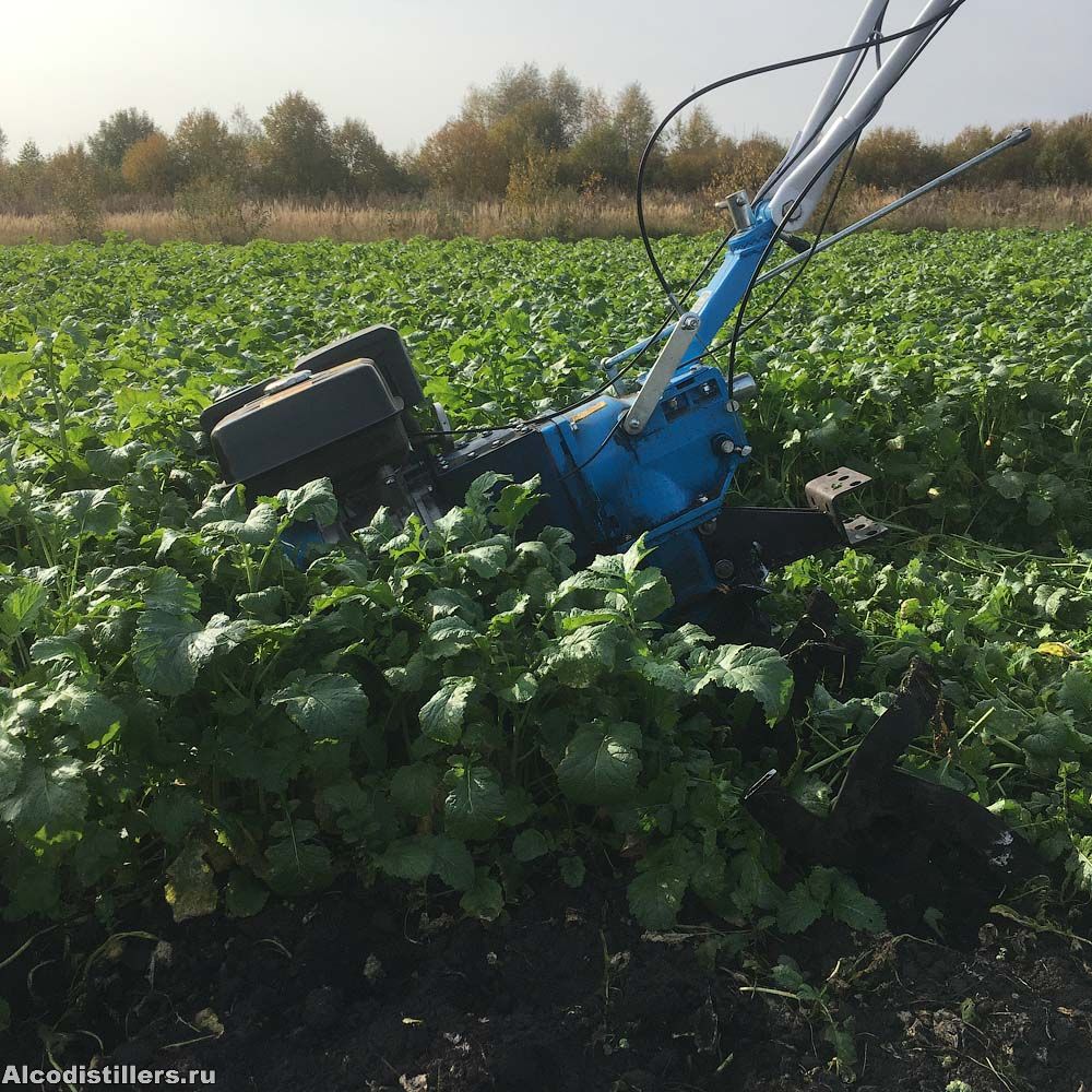 Горчица выросла хорошая, начала набивать бутоны, пора запахивать, но такую высокую плугом запахивать сразу тяжело, поэтому "пробежался" по ней фрезами, завалил и часть поломал.