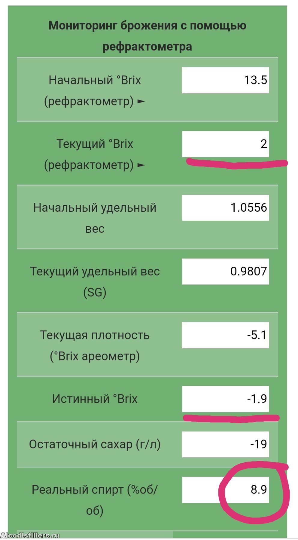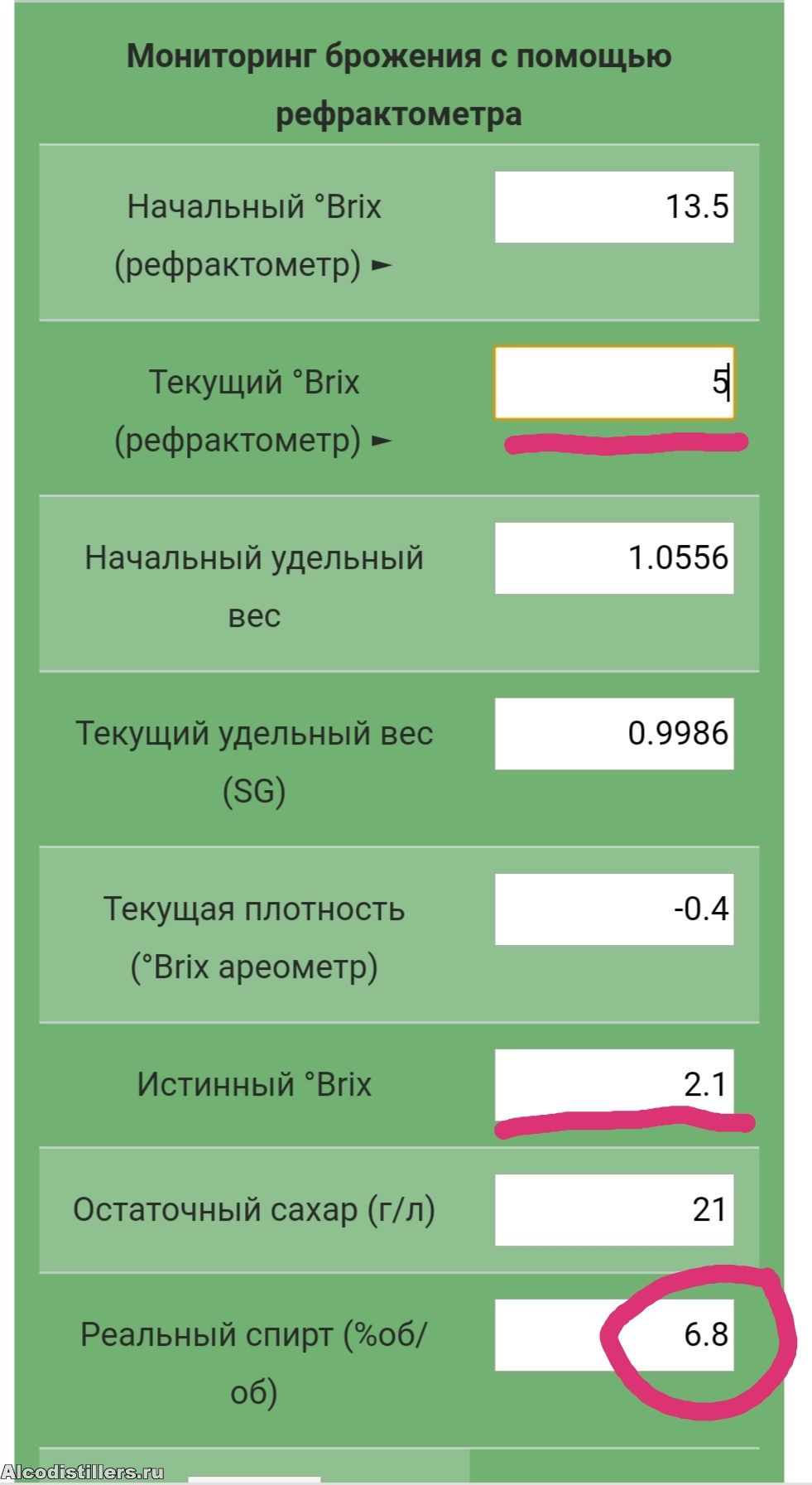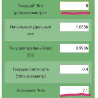 Как рассчитывал? Если взять калькулятор и НП 13.5 и КП 5 (смотри графу "истенный °Brix" там будет 2.1%. Если поставить в текущий 2%, то истенный уйдёт в минус, а этого не может быть:![]()