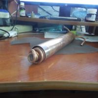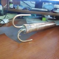 Припаял трубки 6мм. Самая длинная ТСА, средняя выход воды, маленькая вход воды. Потом засыпал в местах сгиба солью и согнул, соль высыпал и промыл. Получилось не очень аккуратно и пайка и загибы, если бы делал второй раз, то припаял бы и загнул аккуратнее, ну не стрелять из него. Крышку с трубками к трубе паять не буду входит весьма плотно, лучше фумкой подматать или кольцо силиконовое отлить и вставить.