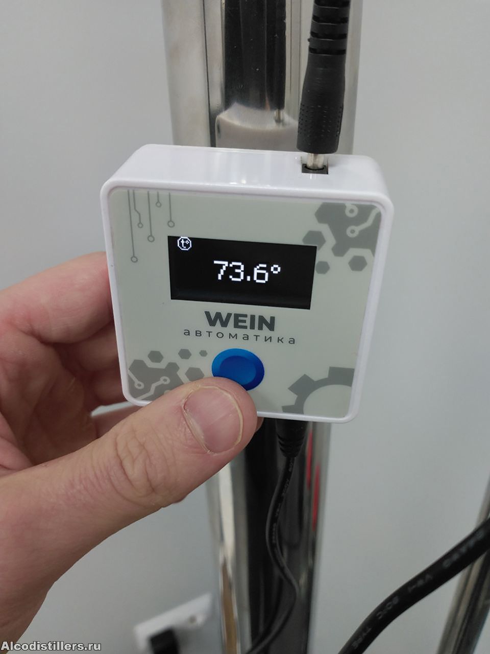 Но есть ещё маленькая деталь, которой мне не хватало. Причем она реально маленькая, а не как кирпич с сегментным дисплеем и шлангами. Встроена прямо в колонну и делает всё сама. Какое-то участие нужно три раза: включить нагрев под баком, подождать, пока система разогреется и в колонне всё устаканится по фракциям – раз. Отобрать головы – два. Поставить банку для финального продукта, открыть кран и нажать одну (одну!) кнопку – три. И всё.