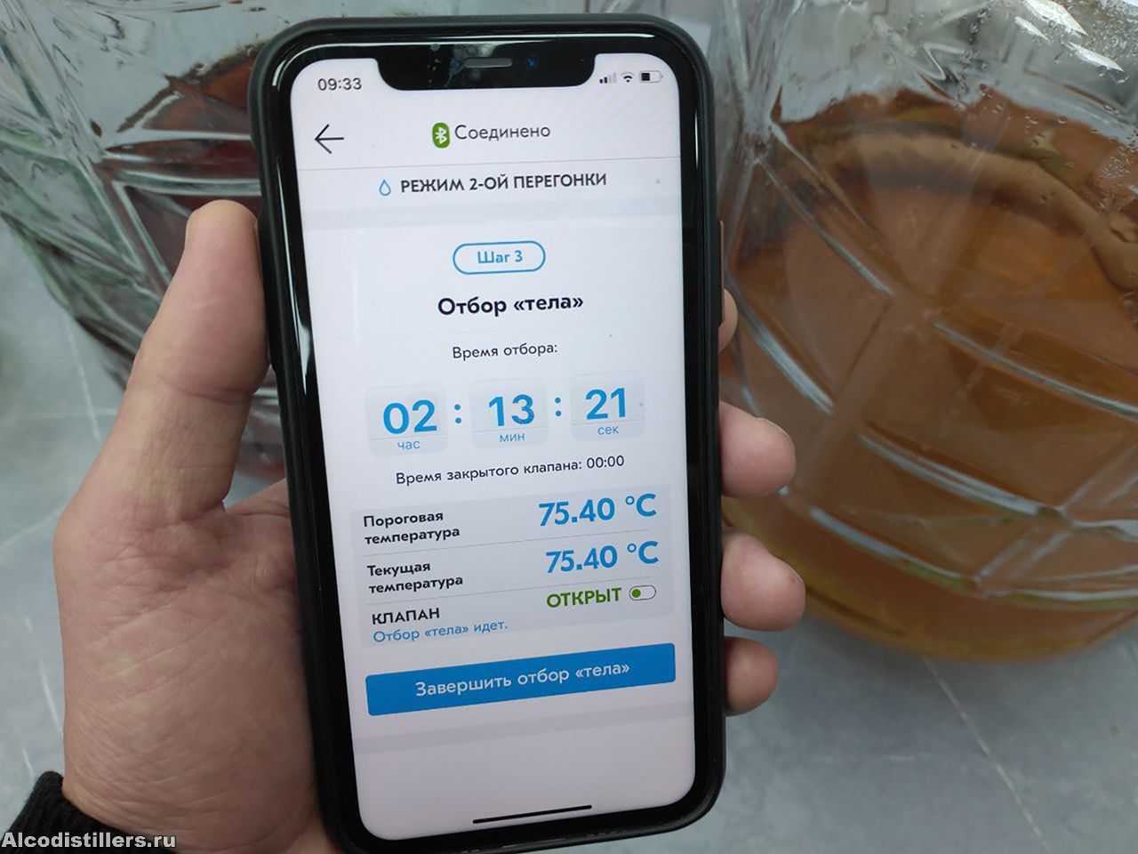Есть мобильное приложение. Которое скажет и сколько «голов» надо перед основным перегоном снять, и про завершение процесса просигнализирует. А «хвостов» и не остается почти, так что один раз кнопку нажал, потом пришел – всё выключил и забрал банку со спиртом. Стоять у плиты не надо, с бубном скакать не надо, примесей вредных нет, если интересно – можно в приложении смотреть, открыт кран или закрыт, как процесс идёт. Если что-то пойдёт не так – то же приложение даст знать.