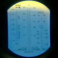 Рефрактометр измеряет преломление света в жидкости. За счет изменения преломления можно получить различные шкалы. Можно иметь шкалу просто с плотностью. Бывает шкала указывающая процент сахара в воде. Бывает шкала указывающая процент спирта в воде. Нужно понимать, что замеряете.