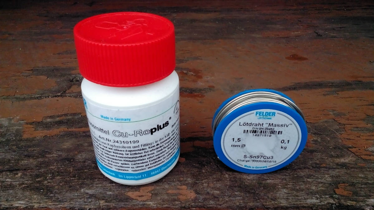 Потом спаял голову. Паял таким припоем и флюсом. Флюс не жидкий как на сайте написано, похож на пену для бритья, очень удобно кисточкой наносить, смывается холодной водой. Места пайки зачищал кухонной губкой, зачищает хорошо, место зачистки блестит как у кота.