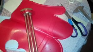 Проверил на воде, все работает, соединения не текут, не греются, проводка справляется (больше всего боялся за нее). Гайку тэна уплотнял кухонной варежкой, у нее толщина 2 мм, а коврика 1 мм, когда замерял толщину штангенциркулем на меня так смотрели продавцы. Вроде силикон, жег - горит плохо, пепел былый.