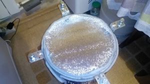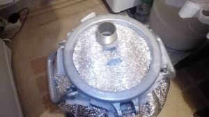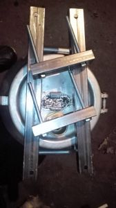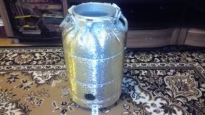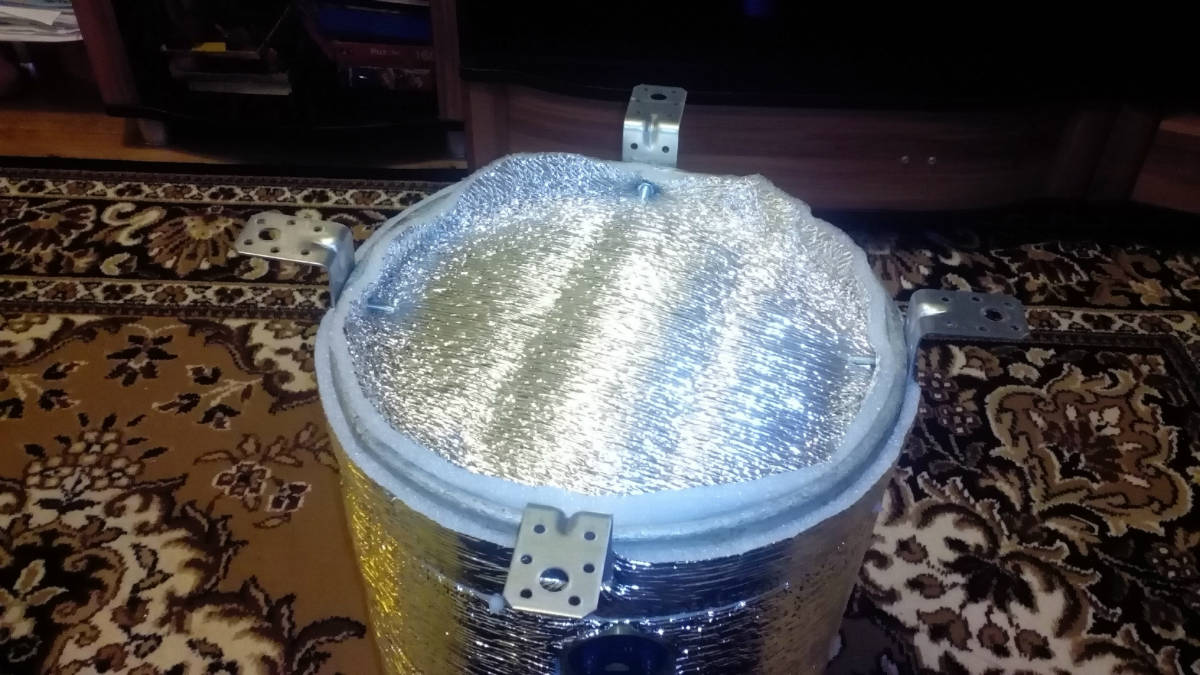 Утеплил флягу 8мм утеплителем. фиксировал пластиковыми хомутами. Из усиленных уголков и болтов на 10 сделал регулируемые ножки.