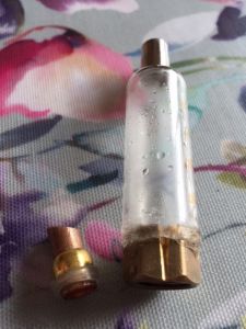 Недостаток- из-за попадания жидкости на стенку, иногда линия разлома идет не по нити. У меня получилось с 3-го раза, благо запас пузырьков был.
