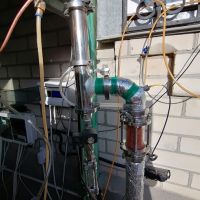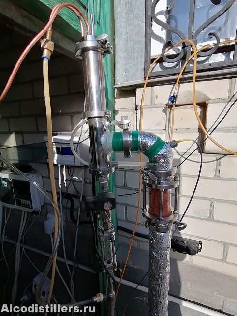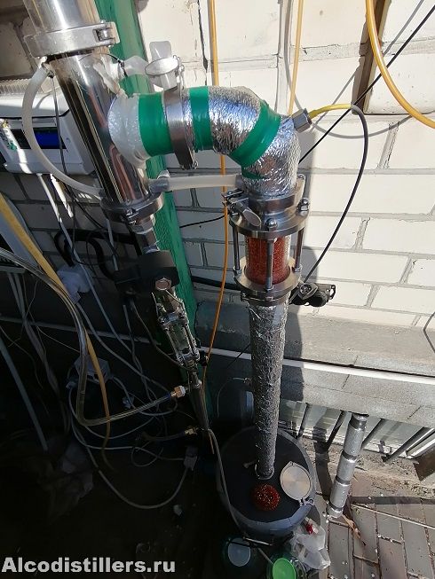 хотел написать про нее сразу, да забыл. Это медная рпн, один рулончик длиной 1,5 метра, очень плотно свернут и засунут в диоптр 51 диаметра, вся остальная царга набита обычными мочалками. Сделано для увеличения контакта с медью, мне показалось что одного димрота и тэна в рк мало будет, и точно такой же рулончик использовал при перегонке браги на сс, потемнел в процессе сильно. А здесь в рк уже четвертый перегон не разбирая и цвет меди не меняется, можно не использовать.