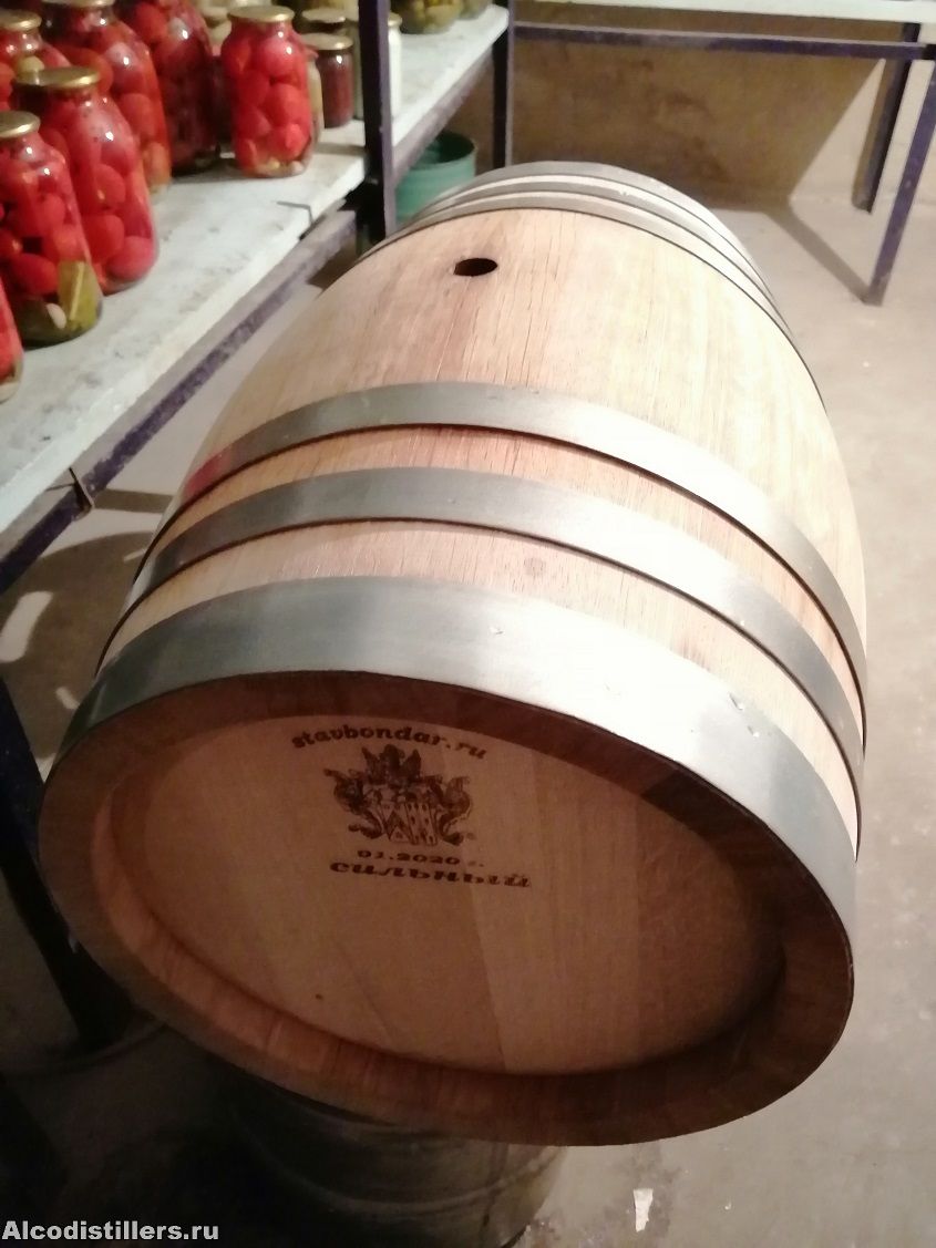 в связи с известными событиями в мире, в город лучше не выходить, и я вплотную занялся изготовлением кукурузного дистиллята. РК не выключалась четверо суток - ночью отбор голов, утром подголовники, до вечера тело, вечером новая партия сырца в куб и разгон. Приноровился  по 20л ректифицировать. За эти дни удалось наполнить новенькую бочку, бочка изумительного качества, за время вымачивания ни капли не просочилось через клепки, с одной стороны чуть запотело в первый день и всё, вымачивал чистой водой 2,5 недели, через день воду обновлял, перед заполнением залил кипятка на пару минут, затем сполоснул холодной водой. По итогу залил 30 литров 65*-ти градусного дистиллята, очень надеюсь, что через месяцев 10-12 что-то путное получится, плюс еще  3 литра 55* оставил в стекле с дубовой палочкой, и еще в трёхлитровую банку слил все вкуснопахнущие подголовники разведенные до 50*. Плюс еще осталось 20 литров сс окло 40* крепости. В общей сложности было изготовлено около 600 литров браги. Кукурузная крупа в заторах количественно преобладала. С кукурузой не хочется больше связываться, уж больно муторно. Потихоньку дегустирую, и кое-где отчетливо ощущается во вкусе и аромате свежее сладкое зеленое яблоко. Фотки прилагаются.
