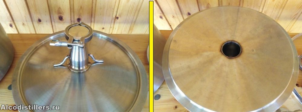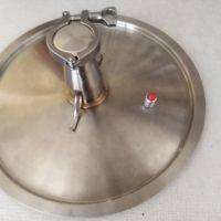 В качестве выходного штуцера крышки применил кламповый переход с 2-х на 1,5 дюйма. Приварить переходник к крышке сначала планировал сам с помощью электросварки, но побоявшись прожечь тонкий металл крышки, обратился к аргонщику. Тот за несколько сотен рублей всё приварил как надо – и переходник к самой крышке кастрюли и его же к разрезанной ручке крышки кастрюли.