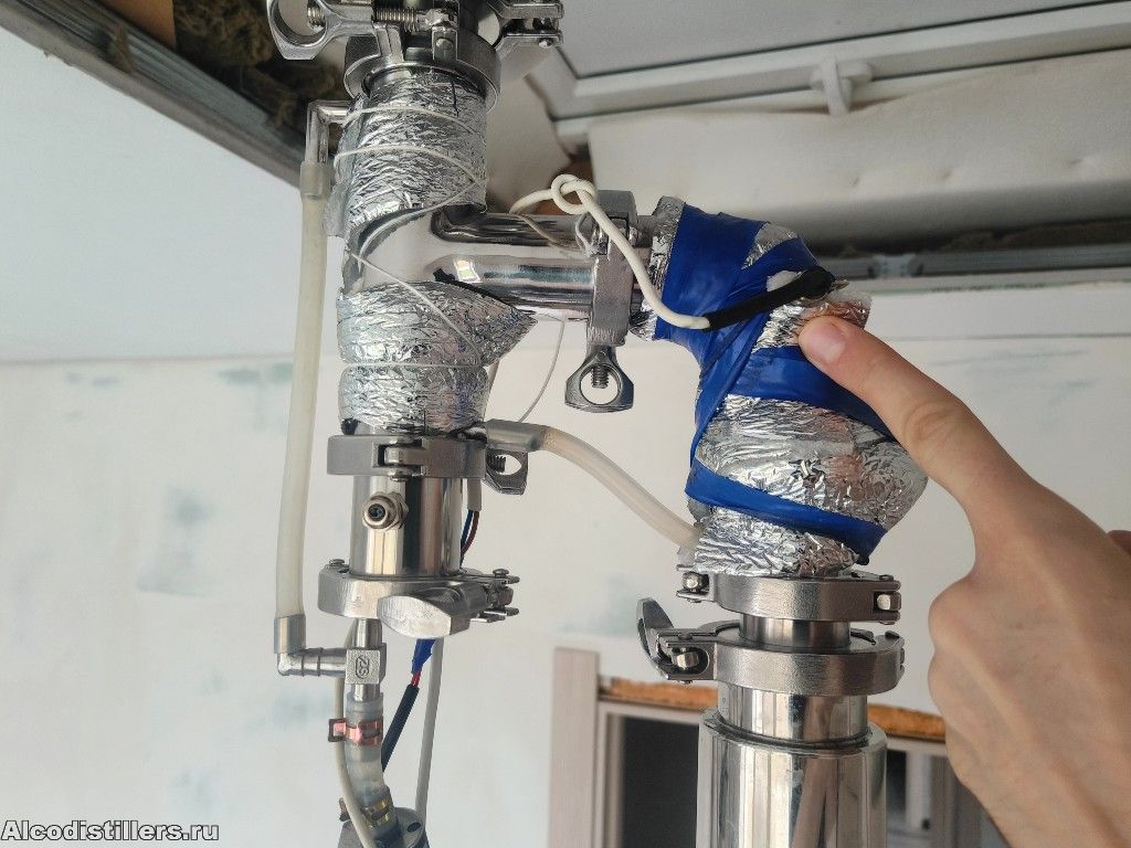 Еще: в такой схеме люди наблюдали затекание флегмы из димрота в тройник, навстречу пару, и, как следствие, попадание в неучтенный возврат. Я бы оставил деф как было в варианте 2, вертикально, но повернул на 45 градусов в том клампе, что между тройниками. В этом случае деф тоже будет наклонным, а стакан отбора будет повыше, и это позволит трубку возврата сделать тоже повыше.