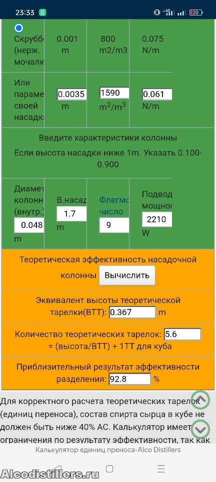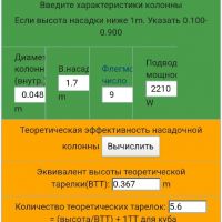 Пористость при этом 77 %, пониже чем у мочалкок в расчёте на 1 странице.... Странно конечно. 3.6 кг насадки, 2.1 кВт и всего 5.6 теоретических тарелок. Иван можете прокомментировать расчёт калькулятора? Другой онлайн калькулятор для моих параметров и этой же медной спн выдал 34 тт.