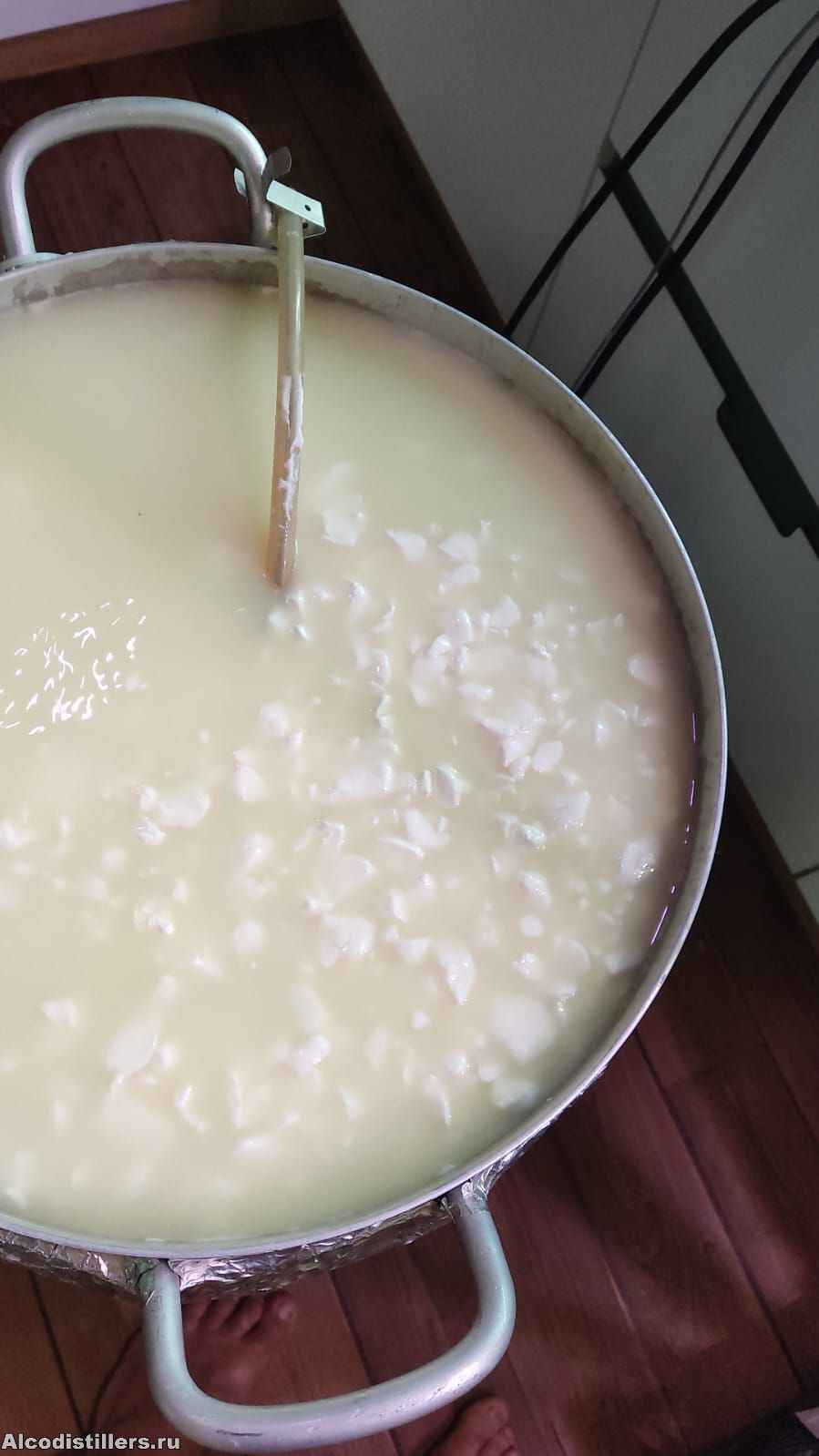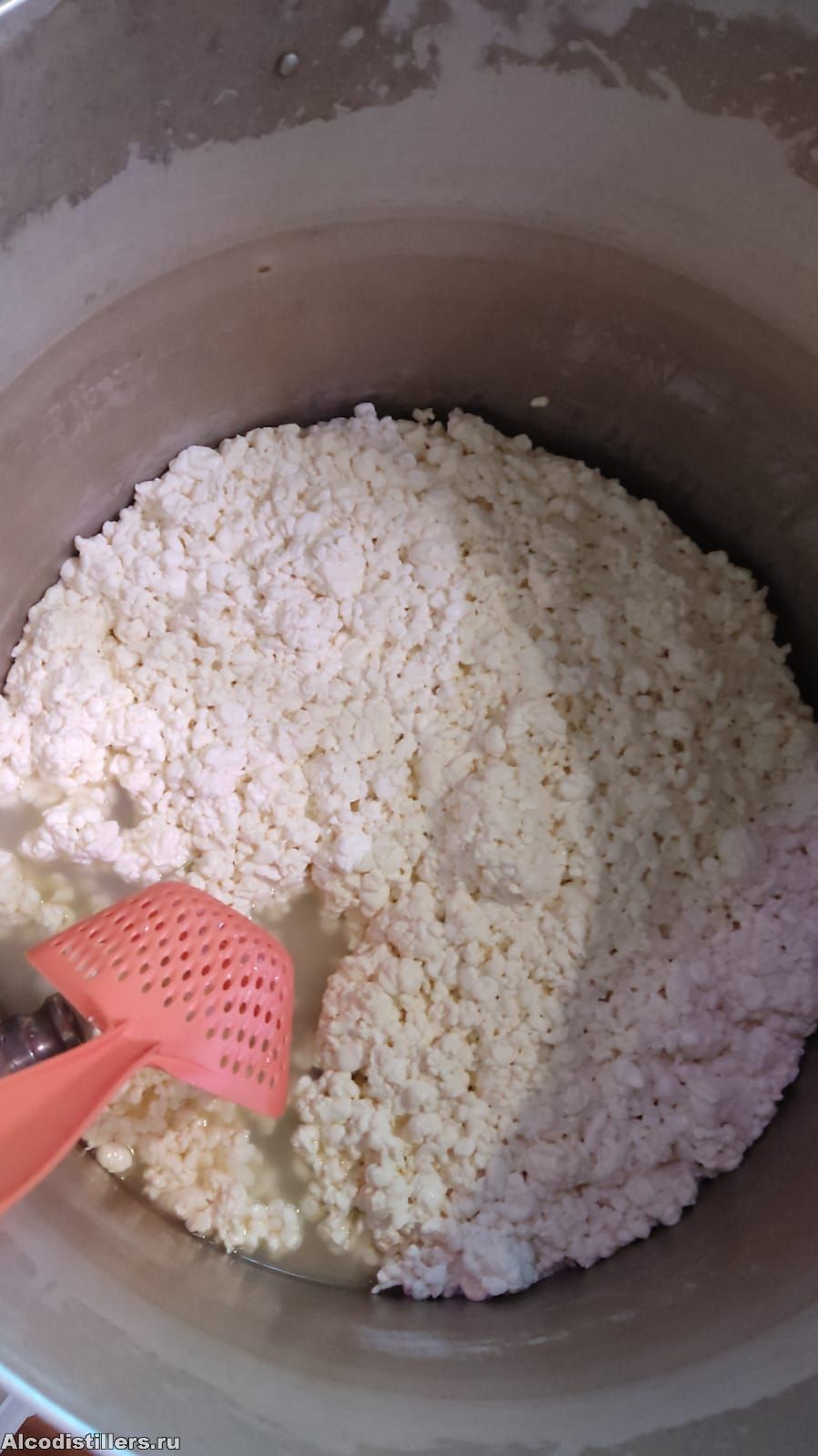 Потом уже купил нож для сгустка, но он так и лежит новый. Резал сгусток стальной линейкой, так как кастрюля 50 литров, такого ножа длинного дома нет.